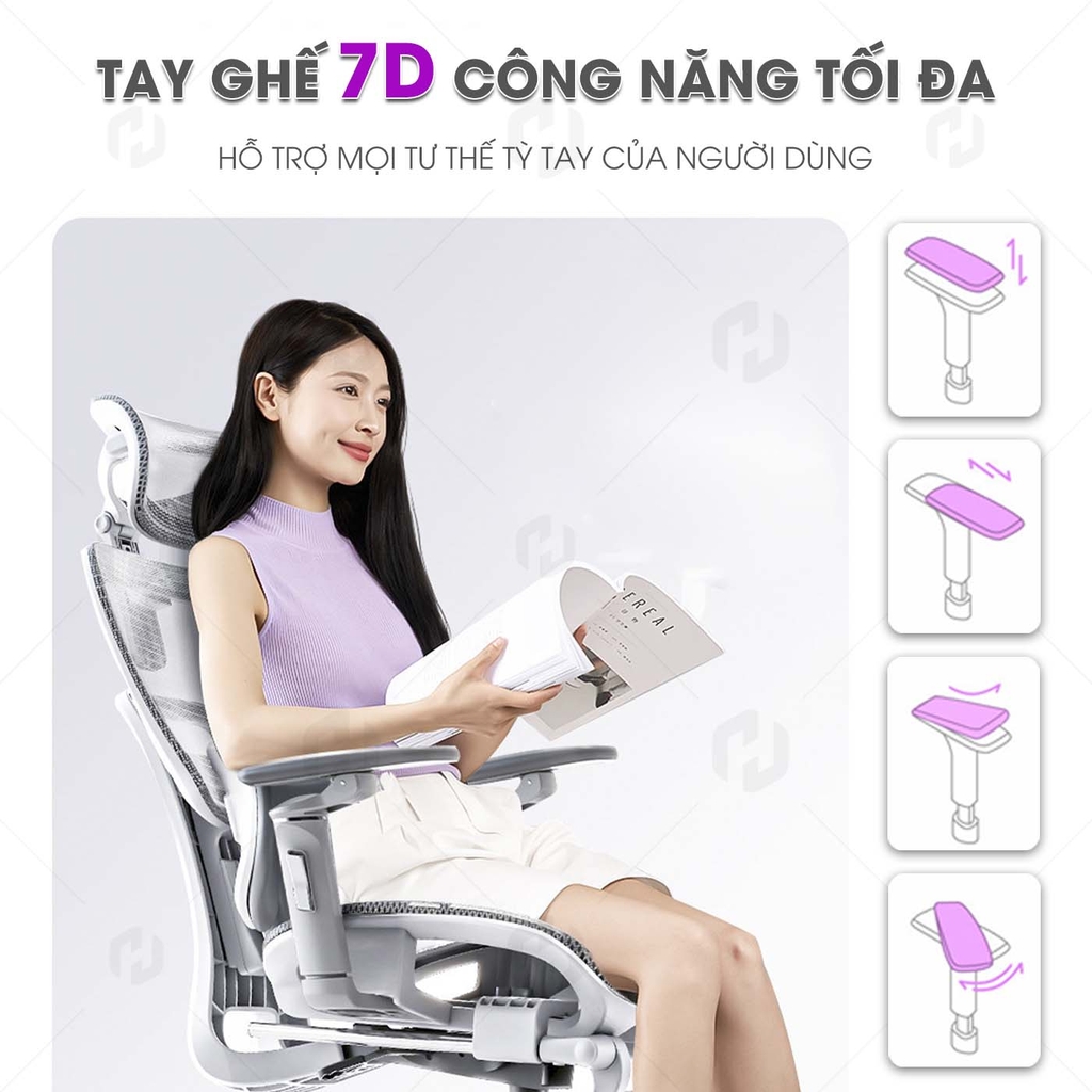 Tay vịn có thể nâng hạ, trượt trước sau, xoay trái phải, phù hợp với mọi tư thế làm việc hoặc giải trí. Đây là điểm mạnh giúp HTD-X360 vượt trội hơn nhiều mẫu ghế thông thường.