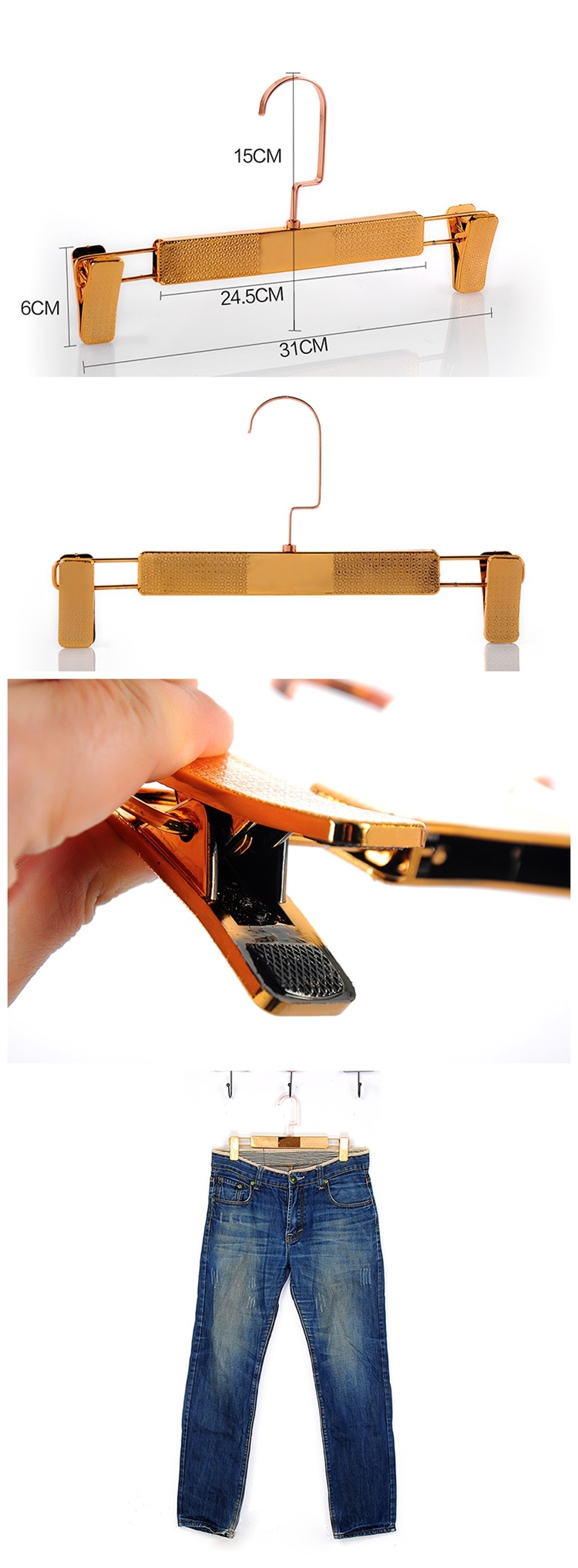 Móc kẹp quần của HTD Việt Nam được làm từ chất liệu nhựa cao cấp, bên ngoài được sơn màu vàng đồng, phù hợp với treo váy, quần, đồ phụ nữ....