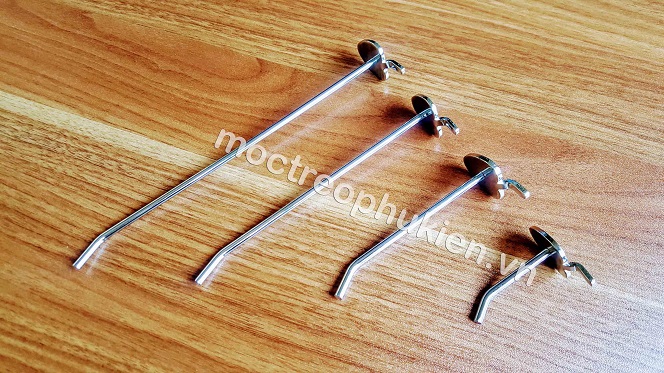 Đường kính thanh treo được thiết kế 4mm. nhỏ gọn, giá thành rẻ, phù hợp treo các mặt hàng cho trọng lượng nhẹ. Phần chân gài được làm với 1 chân treo, phù hợp với tất cả các loại tấm sắt đục lỗ có trên thị trường.