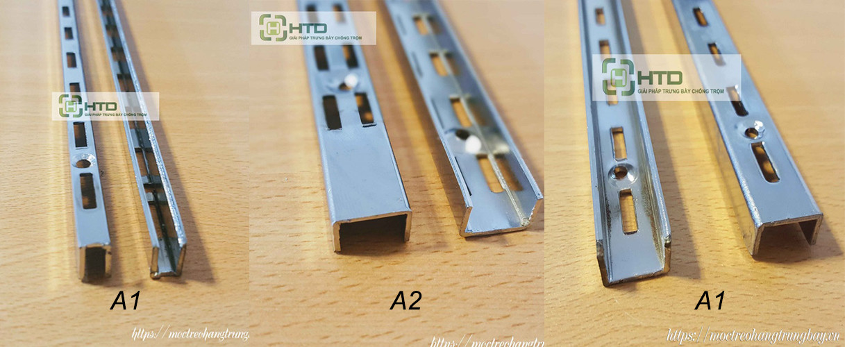 Đối với A1: đây là đạng thông dụng nhất hiện nay được thiết kế 1 hàng lỗ, chiều rộng bề mặt khoảng 7mm, thiết kế dạng thanh nhỏ, đơn giản phù hợp với các dạng kệ có tải trọng khoảng 30kg.