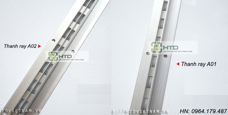 Điểm khác nhau: Với thanh ray A01 chúng được thiết kế với 1 hàng lỗ trên thanh, còn với A02 chúng được thiết kế 2 hàng lỗ, có thể lắp đặt bộ kệ dạng đối xứng nhau.